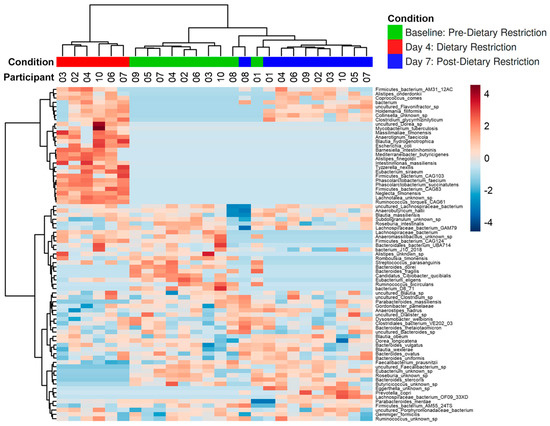 ALDEx2 was then used to perform species-level differential abundance analysis to determine which species were driving compositional changes after dietary intervention. Seventy-seven species were found to be significantly different between the three conditions (FDR p < 0.05). Figure 5 shows an abundance heat map of significant species with unsupervised clustering. The most prominent species at Baseline demonstrated a marked decrease in abundance after restricted dietary intervention (Day-4). After resuming an unrestricted diet, there was a notable return to the pre-intervention state, with the majority of bacterial species present at Baseline seen in abundance on Day-7. Despite this generalized recovery of the flora, several unique microbial signatures that emerged on Day 4 persisted into Day-7.