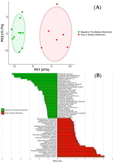 Baseline v. Day-4. Principal component analysis of species present between the two conditions (A). Effect size graph of significantly different species (FDR p < 0.05, effect size > 1) (B).