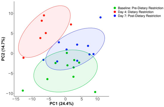Principal component analysis of species abundance after prevalence filtering. Dietary restriction caused unique species composition, while Baseline and Day-7 conditions showed adjacent clustering, representing group similarities.