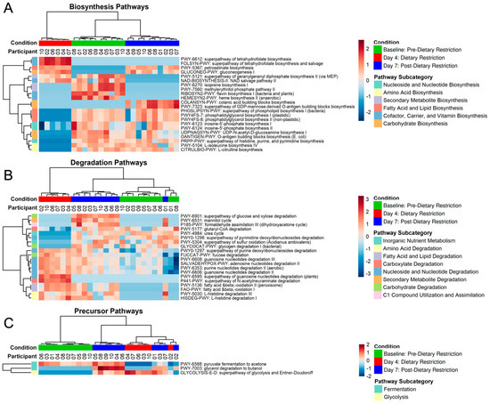 Heatmap of significantly different pathways (FDR p < 0.05). Based on MetaCyc ontology classification, pathways were categorized as biosynthesis (A), degradation (B), or precursor metabolic pathways (C).