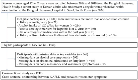 Among the 5024 premenopausal women initially enrolled, we excluded participants who met one or more of the following criteria (Figure 1): (1) missing information on VMSs, body mass index, alcohol consumption, and hepatic steatosis; (2) a history of malignancy; (3) an alcohol intake of ≥20 g/day; (4) positive serologic markers for hepatitis B or C virus; (5) the use of steatogenic medications within the past year; and (6) a history of liver cirrhosis or findings of liver cirrhosis on ultrasound. The final study sample included 4242 premenopausal women.