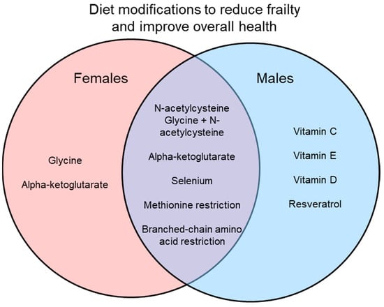 Many interventions have been suggested to reduce frailty and improve overall signs of health, with some of these interventions involving dietary modifications. Here, vitamin supplements, dietary supplements, and amino acid restriction diets in preclinical models have been reviewed as interventions for frailty. While many of these dietary changes do show positive results in improving health, most do not directly measure frailty or use only a single sex, mostly males. In studies that do use both sexes, they often find sex differences in the results as shown in Figure 1 and Figure 2. Interestingly, some interventions increase lifespan in a sex-specific manner (Figure 1), so studies of underlying mechanisms need to use both sexes as these also may differ in males and females. Similarly, studies of interventions on indices of overall health and frailty have found sex-specific effects (Figure 2). Another limitation is that while many studies did measure signs of health (i.e., metabolism, chronic inflammation), most did not measure frailty directly. It would be interesting to know how these markers of aging change in relation to dietary interventions and then link those changes to frailty scores.
