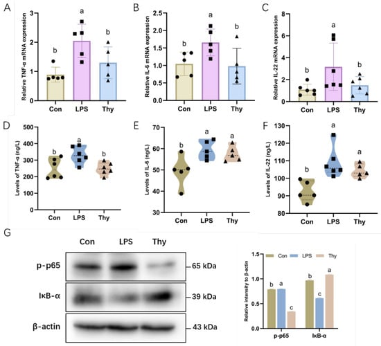 Thymol ameliorates LPS-induced inflammation. The mRNA levels of inflammatory cytokines (A) TNF-α; (B) IL-6; and (C) IL-22 in the liver (n = 5–6). The concentration of (D) TNF-α; (E) IL-6; and (F) IL-22 in the liver, as determined by ELISA analysis (n = 5–6). (G) The expression and quantification of p-p65 and IκB-α in the liver as determined by Western blotting. Values are normalized to β-actin levels and expressed as the mean ± SD (n = 6). Con, control; Thy, thymol. Differences were presented with different superscript letters (p < 0.05).