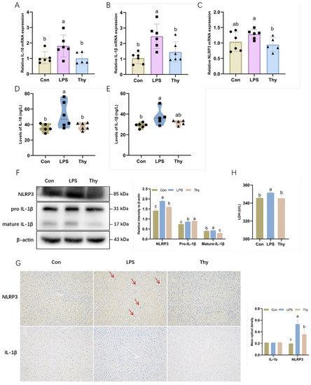 Tryptophan inhibits the NLRP3 inflammasome to defend against inflammation. The mRNA expression of (A) IL-18; (B) IL-1β; and (C) NLRP3 in the liver (n = 5–6). The concentration of (D) IL-18 and (E) IL-1β in the liver as examined by ELISA analysis (n = 5–6); (F) The expression and quantification of NLRP3 and IL-1β in liver as determined by Western blotting. Values are normalized to β-actin levels and expressed as the mean ± SD (n = 6); (G) Immunohistochemistry of NLRP3 and IL-1β in the liver (200 × magnification). The mean optical density of immunohistochemistry. Values are expressed as the mean ± SD (n = 3); (H) The activity of LDH in primary hepatocytes (n = 3). Con, control; Thy, thymol. Differences were presented with different superscript letters (p < 0.05).