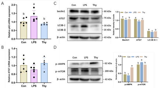 Thymol regulates the AMPK–mTOR autophagy pathway during inflammatory responses. The mRNA levels of autophagy-related genes (A) p62 and (B) ATG7 in the liver (n = 5–6); (C) The expression and quantification of autophagy-related proteins in the liver as determined by Western blotting. Values are normalized to β-actin levels and expressed as the mean ± SD (n = 6); (D) The expression and quantification of p-AMPK and p-mTOR in the liver as determined by Western blotting. Values are normalized to β-actin levels and expressed as the mean ± SD (n = 6). Con, control; Thy, thymol. Differences were presented with different superscript letters (p < 0.05).