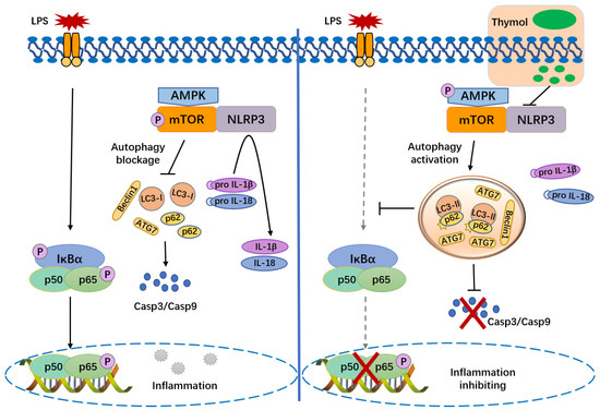 Due to the involvement of the liver in detoxification and metabolic equilibrium in various ways, liver dysfunction is a widespread concern [22]. The current study demonstrates that thymol pretreatment significantly decreases the liver inflammation and hepatocellular apoptosis, preventing the hepatic injury caused by LPS in mice. Based on these findings, the activation of the NLRP3 inflammasome and modulation of the AMPK–mTOR autophagy-signaling pathway was suppressed by thymol (Figure 6).