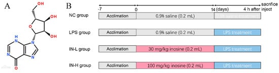 Inosine from Corynebacterium spp. was obtained from Sangon Biotech Co., Ltd., (Shanghai, China), and its chemical structure is shown in Figure 1A. LPS was obtained from Sigma-Aldrich (Saint Louis, MO, USA). The assay kits for TNF-α, IL-1β, and IL-6 were obtained from R&D Systems (Shanghai, China). Malondialdehyde (MDA), superoxide dismutase (SOD), catalase (CAT), myeloperoxidase (MPO), lactate dehydrogenase (LDH), glutathione peroxidase (GSH-PX), and reactive oxygen species (ROS) assay kits were purchased from Jiancheng Bioengineering Institute (Nanjing, China).