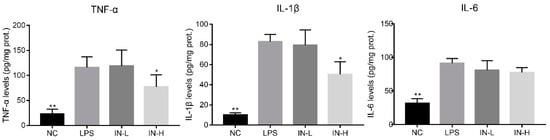 Effects of inosine pretreatment on the levels of TNF-α, IL-1β, and IL-6 in mice treated with LPS. * p < 0.05; ** p < 0.01, relative to the LPS group.