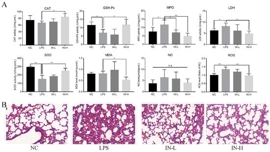 Effects of inosine pretreatment on the levels of CAT, GSH-Px, SOD, MPO, LDH, MDA, NO, and ROS in mice treated with LPS (A); histological examination of lung tissue by hematoxylin–eosin staining (B). * p < 0.05; ** p < 0.01, relative to the LPS group, n.s.: not significant.
