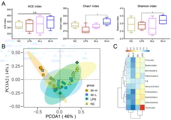 Effects of inosine on the alpha diversity and structure of the intestinal microbiota: Alpha diversity analysis including ACE index, Chao1 index, and Shannon index (A). PCA analysis of intestinal microbiota (B). Heatmap of proportions at the phylum level (C). * p < 0.05; relative to the LPS group, n.s.: not significant.