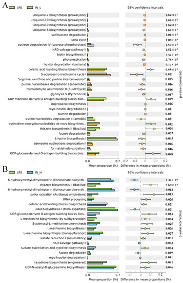 PICRUSt2 was applied to investigate the bacterial functions of the members among different groups. A total of 22 potential functional profiles of intestinal microbiota were significantly altered between the NC and LPS groups (Figure S2), of which 5 potential functional profiles were remarkably upregulated and 17 potential functional profiles were remarkably downregulated in the LPS group relative to those in the NC group. Notably, 24 potential functional profiles were significantly increased and 5 potential functional profiles were remarkably reduced in the IN-L group compared to the LPS group (Figure 5A). However, 6 potential functional profiles were significantly increased and 13 potential functional profiles were remarkably decreased in the IN-H group compared with the LPS group (Figure 5B). There were remarkable discrepancies in the potential functional profiles of intestinal microbiota between the IN-L and IN-H groups, which may have been associated with the inosine-induced beneficial effects.