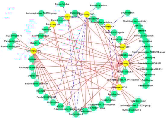 Correlation network established between intestinal microbiota and oxidative stress related to lung injury: The solid red line and dotted blue line represent the positive and negative correlation, respectively. In addition, the line width indicates the strength of correlation.