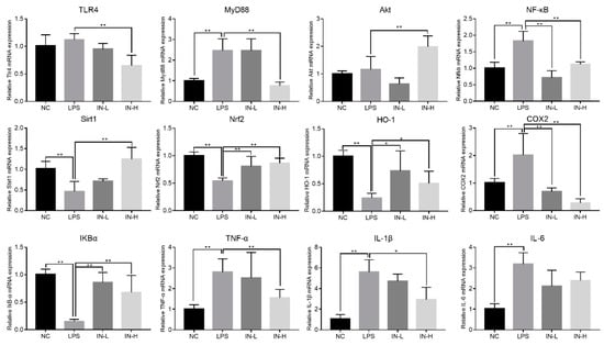 Impact of inosine pre-intervention on the transcription of genes related to the TLR4/MyD88/NF-κB signaling pathway in mice treated with LPS. * p < 0.05; ** p < 0.01, relative to the LPS group.