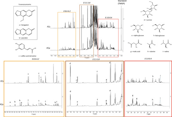 Comparison of 1H-NMR profiling of FCs and FCa: on top, entire spectrum; at the bottom, region from δ 8.6 to 6.2 (orange), region from δ 5.5 to 3.8 (brown), region from δ 3.0 to 0.4 (red) where a = bergapten, b = psoralen, c = caffeic acid derivative, d = sucrose, e = α-glucose, f = β-glucose, g = malic acid, h = alanine, i = valine.