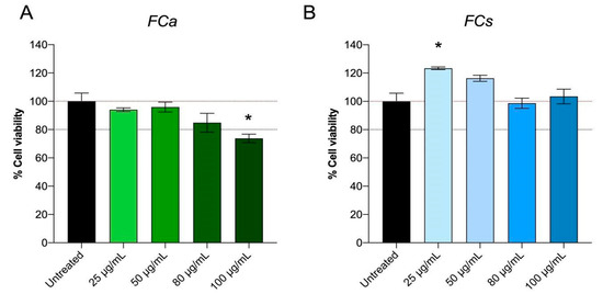 Specifically, 3T3-L1 adipocytes were treated at different concentrations of FCa ranging from 25 μg/mL to 100 μg/mL for 48 h. MTT assay results showed that FCa treatment does not induce any cytotoxic effect on 3T3L-1 up to a concentration of 80 μg/mL, whereas dosages higher than 80 µg/mL resulted in cell suffering with a statistically significant decrease in cell viability (p < 0.05) (Figure 2A). On the contrary, FCs treatment showed good cell viability for all the concentrations tested (25, 50, 80 and 100 μg/mL) (Figure 2B) and interestingly, the lowest FCs dosage used (25 μg/mL) significantly increased cell metabolic activity (p < 0.05). Therefore, FC dosages at which no toxicity and good biocompatibility and cell viability was observed (25, 50 and 80 μg/mL) were selected for the following experiments.