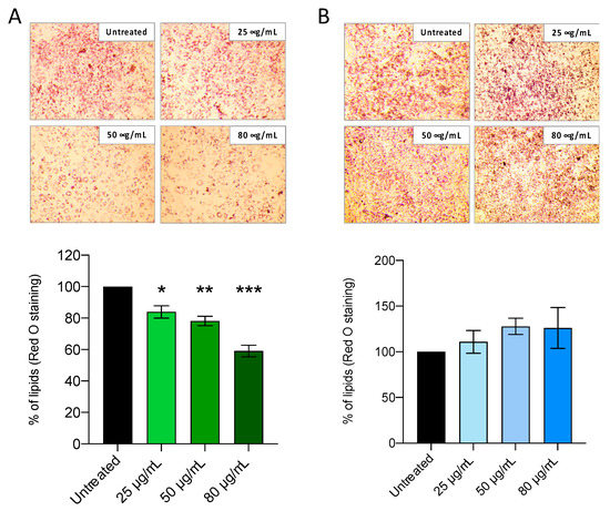 Figure 3 shows that FCa treatments, but not FCs, were able to induce a dose-dependent decreasing trend of adipocytes stained with Oil Red-O that specifically binds to fatty acids and lipid depots [34]. In order to semi-quantitatively assess lipid accumulation in cultured adipocytes, Oil Red-O dye was extracted with isopropanol and then evaluated spectrophotometrically. As shown in Figure 3A, FCa treatment was able to significantly reduce lipid accumulation by 20% at the lowest dosages (25 μg/mL; p < 0.05), up to a reduction of nearly 40% at the highest dosage used (80 μg/mL; p < 0.001). On the contrary, no significant differences were observed for FCs treatment for any of the dosages used (Figure 3B).