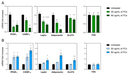 Considering the results obtained from cell cytotoxicity and lipid accumulation, FC phytoextracts treatments at both 50 and 80 μg/mL were chosen to further investigate whether FCa and FCs were able to modulate genes involved in adipogenesis, adipocyte differentiation and lipid accumulation. In this regard, the gene expression of key adipogenesis activators such as Peroxisome proliferator-activated receptor γ (PPARγ) and CCAAT/enhancer-binding protein α (C/EBPα) were investigated [35]. They mutually induce the expression of each other and have been reported to cooperate in the activation of a few adipogenic marker genes as Leptin, Adiponectin and GLUT4 [36]. In particular, our results demonstrated that FCa significantly decreased the gene expression of PPARγ (p < 0.05, Figure 4A) at both dosages used.
