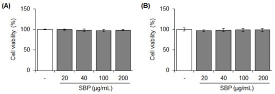Stimulation and toxicity to cells did not occur at any tested concentrations of the SBP extract (Figure 1). Considering the use of this extract for the development of future health-functional food materials, 200 μg/mL concentration of the SBP extract was deemed safe and suitable and was used in the subsequent experiments.