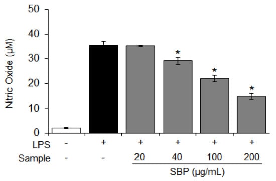 The NO is a major mediator of the inflammatory response, and excessive production of NO activates the expression of COX-2 [32]. Considering these findings, we investigated the inhibition of NO production when Raw264.7 cells induced by LPS were treated with the SBP extract. The amount of NO produced in the inflammation-induced group was increased (35.5 μM) compared to that in the control group, and the amount of NO production was reduced in a dose-dependent manner (* p < 0.05) upon treatment with the SBP extract (Figure 2).
