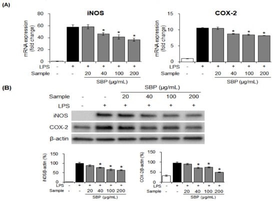 To determine whether the SBP extract had an inhibitory effect on NO production because of the regulation of iNOS and COX-2, the mRNA and protein expression of iNOS and COX-2 was measured. Treatment with the SBP extract significantly reduced iNOS and COX-2 mRNA and protein expression in a concentration-dependent manner (* p < 0.05). This indicated that the SBP extract could regulate the inflammatory reaction by suppressing the expression of inflammation-mediator genes (Figure 3).