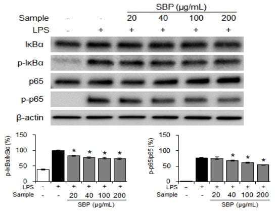 Under normal conditions, NF-κB binds to inhibitor of the transcriptional factor NF-κB (IκBα) and maintains an inactive state. When stimulated by LPS, cytokines, and reactive oxygen species, NF-κB is activated via phosphorylation of IκBα, resulting in the increased expression of inflammatory cytokines, COX-2, and iNOS, and may lead to inflammatory and degenerative diseases [33,34,35,36]. Therefore, the effect of SBP extract on NF-κB transcriptional activity was studied using western blot analysis. The SBP extract dose-dependently inhibited the expression of p-IκBα and p-p65 after activation by LPS (Figure 4).