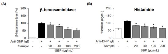 β-hexosaminidase is a key marker of degranulation of mast cells, and its secretion is increased during the allergic inflammatory response [37]. We investigated the effect of SBP extract on β-hexosaminidase degranulation; the results are shown in Figure 5A. When allergen-induced RBL-2H3 cells were treated with 20, 40, 100, and 200 μg/mL of SBP extract, the inhibitory effect on β-hexosaminidase secretion was evident at the maximum concentration of the extract.