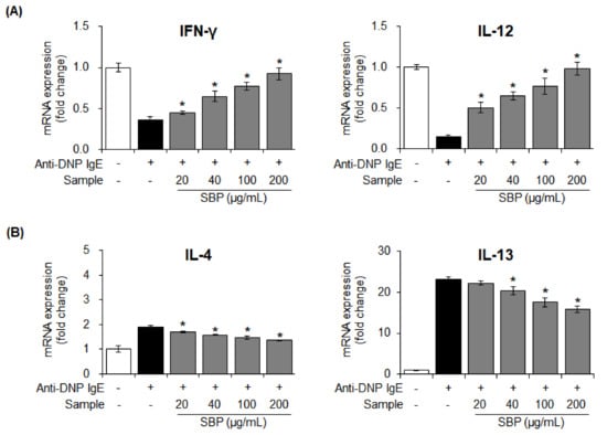The mRNA expression of pro- and anti-inflammatory cytokines secreted from Th1/2 cells after the treatment of activated mast cells with the SBP extract was measured with Real-Time Quantitative Reverse Transcription PCR (qRT-PCR). In the allergy-induced group, the mRNA expression of IFN-γ and IL-12 was reduced, and the expression of IL-4 and IL-13 was significantly increased after treatment with anti-DNP IgE. However, treatment with SBP extract led to the recovery of the expression of anti-inflammatory cytokines (IFN-γ, IL-12) to the level in the control group (* p < 0.05). Contrastingly, the extent of pro-inflammatory cytokine secretion (IL-4, IL-13) was significantly (* p < 0.05) reduced upon treatment with the SBP extract (Figure 6).