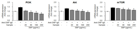 When a foreign antigen invades the body, a normal or allergic state is established via immune regulation, mainly by the activity of T cells. The growth of T cells, which are mainly involved in immunity, is regulated by the activation of PI3K/mTOR signaling, and degranulation of mast cells activates PI3K/mTOR sub-factors [40]. Based on this theory, we measured the gene expression of PI3K/mTOR pathway factors in allergen-sensitized mast cells (treated with anti-DNP IgE) treated with the SBP extract. The mRNA expression of PI3K, Akt, and mTOR was increased by allergic stimulation; nevertheless, with SBP extract treatment, this effect decreased in a dose-dependent manner (* p < 0.05) (Figure 7). We speculate that the SBP extract is effective in regulating T-cell growth and immune activity, because the highest concentration of the SBP extract restored the gene expression of PI3K/mTOR pathway factors to a level like that in the non-allergic normal group.