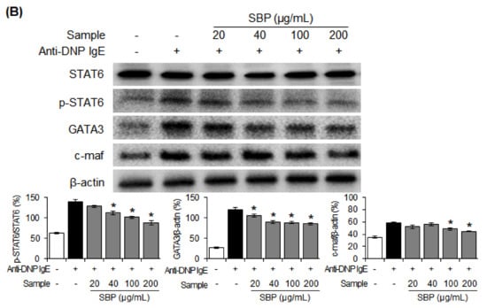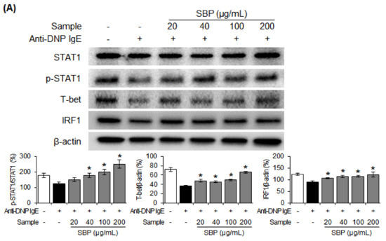 The LPS (1 μg/mL) or anti-DNP IgE (200 ng/mL) and SBP extract-treated cells were lysed in a lysis buffer (50 mM Tris-hydrochloride (HCl), 150 mM sodium chloride, 0.5% Triton X-100, 0.5% NP-40, 0.1% sodium deoxycholate, and 1 mM EDTA) for 40 min on the ice. Then, the supernatant was collected through centrifugation (12,000× g, 4 °C, 20 min). Proteins were separated via 4–20% sodium dodecyl-sulfate polyacrylamide gel electrophoresis (SDS-PAGE) and then transferred onto a polyvinylidene fluoride (PVDF) membrane. The membrane was blocked with skim milk for 1 h and then incubated overnight at 4 °C with appropriate primary antibodies (iNOS, COX-2, STAT1, p-STAT1, T-bet, interferon regulatory factor 1 (IRF1), STAT6, p-STAT6, GATA binding protein 3 (GATA3), c-maf, and β-actin). After incubation, the cells were washed with 1× TBST and incubated with the secondary antibody for 1 h. Enhanced chemiluminescence was used to develop protein bands, and the signal was detected using a Chemi-doc image detector (Bio-Rad, Hercules, CA, USA).