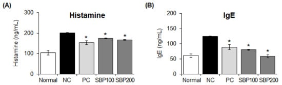 We measured plasma IgE and histamine concentrations in mice administered the SBP extract and found that these concentrations were significantly (* p < 0.05) increased in the NC group compared to those in the normal group. Allergy was induced, as evident by the increase in the concentrations of the two compounds, and treatment with the SBP extract reduced histamine and IgE concentrations similarly or more effectively than in the drug administration group (PC) (* p < 0.05) (Figure 9).