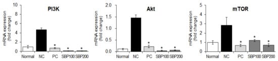 Next, we investigated the mechanisms underlying the effects of SBP extract on PI3K, Akt, and mTOR expression in OVA/Alum-induced mice. The NC group induced with OVA/Alum showed increased PI3K, Akt, and mTOR expression compared with the normal group without any treatment, and this effect was reversed in the drug-treated (PC) and SBP extract-administered groups (* p < 0.05) (Figure 10).