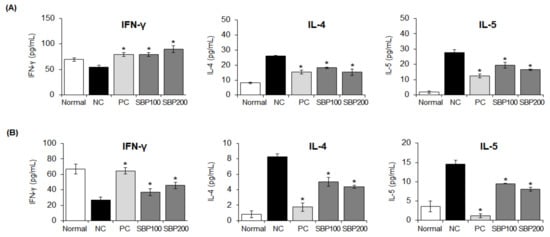 Therefore, the effect of SBP extract on T-cell differentiation-regulating cytokine production was investigated. Cytokine production was measured in the BALF and plasma. IFN-γ (Th1 cell-differentiation cytokine) production increased in a concentration-dependent manner (* p < 0.05) in the SBP extract group compared with that in the NC group. IL-4 and IL-5 (Th2 cell-differentiation cytokines) production was reduced (* p < 0.05) (Figure 11).