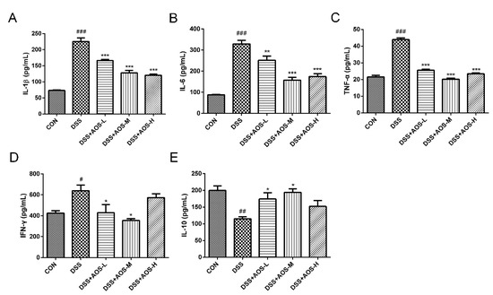 Effects of AOS on the production of proinflammatory cytokines in vivo as detected by ELISA analysis of the levels of IL-1β (A), IL-6 (B), TNF-α (C), IFN-γ (D), and IL-10 (E) in the serum of DSS-induced acute colitis mice. * p < 0.05, ** p < 0.01, *** p < 0.001 vs. DSS group; # p < 0.05, ## p < 0.01, ### p < 0.001 vs. Control group; n = 6.