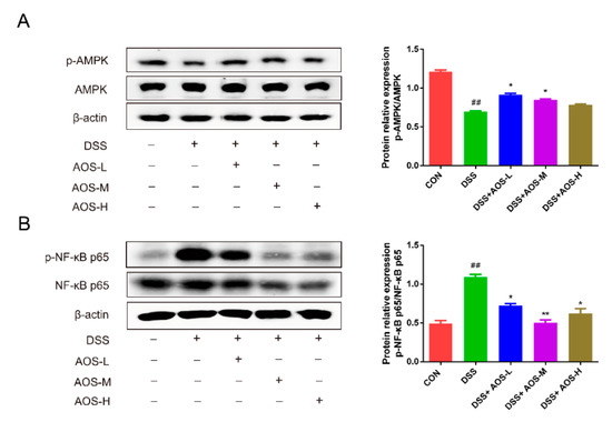 Previous studies have shown the involvement of AMPK in suppressing NF-κB activation and inflammation [37]. The potential mechanisms of AOS in alleviating inflammation were further explored by analyzing AMPK and NF-κB phosphorylation in AOS-pretreated mice with colitis. In Figure 5A, DSS challenge was seen to decrease AMPK phosphorylation in colonic tissues (## p < 0.01 vs. Control group), but this decrease was curbed by AOS administration. Compared with the DSS group, the AOS-M group showed a significant increase in p-AMPK levels (p < 0.05). In Figure 5B, DSS-induced NF-κB activation was observed in colonic tissues, as evidenced by the increased p-p65 levels (## p < 0.01 vs. Control group). However, the p-p65 levels showed a remarkable decrease in all the three AOS groups versus the DSS group (* p < 0.05, ** p < 0.01 vs. DSS group).