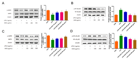 Next, we investigated the effects of AOS on AMPK and NF-κB phosphorylation in LPS-stimulated RAW 264.7 and BMDM cells in vitro. In Figure 6A, AMPK phosphorylation level was seen to be significantly downregulated under 1 h LPS stimulation (## p < 0.01 vs. Control group), but AOS pretreatment (125, 250, and 500 μg/mL) could significantly upregulate p-AMPK levels in different degrees (* p < 0.05, ** p < 0.01 vs. LPS group). After 1 h LPS administration, NF-κB phosphorylation level showed a marked increase in RAW 264.7 cells (## p < 0.01 vs. Control group), but this increase was significantly blocked by AOS pretreatment (Figure 6B). Specifically, 250 and 500 μg/mL AOS pretreatment could significantly suppress the p-p65 level (* p < 0.05, ** p < 0.01 vs. LPS group), and 125 μg/mL AOS pretreatment could also inhibit p65 phosphorylation, but not significantly. In Figure 6C,D, AOS treatment was also seen to increase p-AMPK level and inhibit NF-κB phosphorylation in LPS-stimulated BMDMs (* p < 0.05, ** p < 0.01 vs. LPS group). These results indicated that AOS could inhibit LPS-induced inflammation by inhibiting NF-κB signaling and activating AMPK signaling.