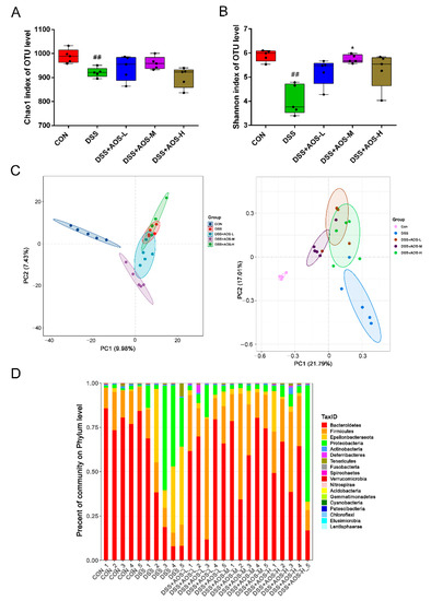 Effects of AOS on gut microbiota overall structure as detected by gut microbiota composition analysis through high-throughput sequencing of 16S rRNA genes. (A) Alpha diversity measured by Chao1. (B) Alpha diversity measured by Shannon index. (C) Beta diversity evaluated by PCA and PCoA analyses. (D) Bacterial taxonomic profiling at phylum level. * p < 0.05 vs. DSS group; ## p < 0.01 vs. Control group; n = 5.
