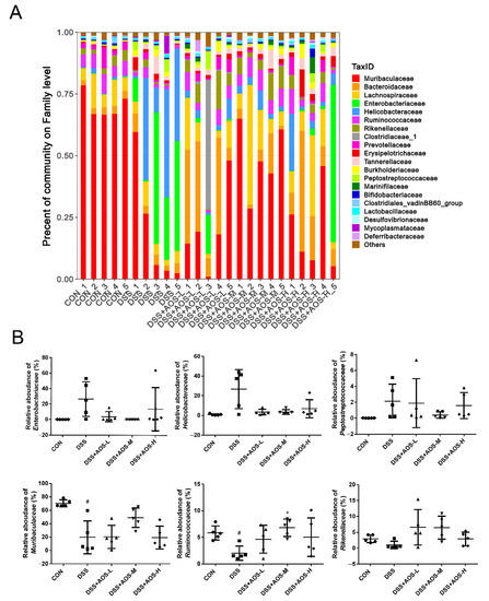 Effects of AOS on the gut microbial composition of colonic contents at family level. (A) Bacterial taxonomic profiling at family level. (B) Relative abundance of gut microbiota at family level. # p < 0.05 vs. Control group, * p < 0.05 vs. DSS group, n = 5.