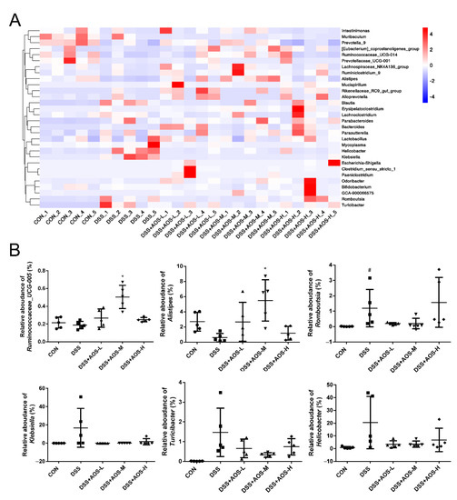 Effects AOS on the gut microbial composition of colonic contents at genus level. (A) Heat map analysis of gut microbial composition at genus level. (B) Relative abundance analysis of gut microbiota at genus level. * p < 0.05 vs. DSS group; # p < 0.05 vs. Control group; n = 5.