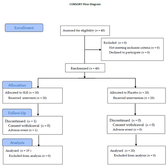 Forty participants were enrolled and randomly assigned to SLE and placebo groups. Two weeks after taking the drug, one participant complained of indigestion and withdrew consent. All other participants completed the 4-week study. Thus, the final analysis included a total of 39 participants in the SLE (n = 19) and placebo (n = 20) groups (Figure 2).