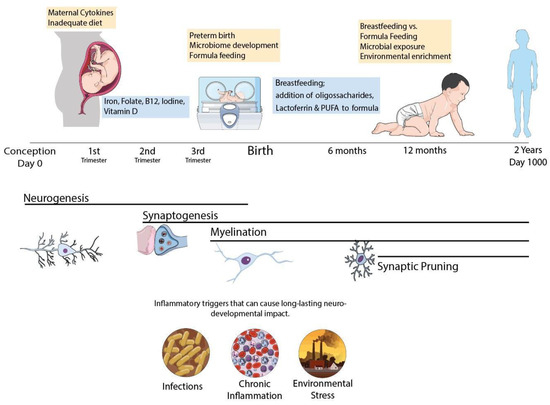 Neurodevelopment is substantially affected by environmental conditions [9], and nutrition is arguably the most important environmental need during development. Adequate nutrition during pregnancy and infancy lay the foundations for neuroplasticity and ultimately the development of cognitive, motor, and socio-emotional skills throughout childhood and adulthood. In the first thousand days after conception, the exponential growth experienced by the brain requires prioritizing nutrients that can maximize neural health and development, which is crucial for nutrient interventions that can impact lifelong brain function [10,11,12,13,14]. Thus, investigating nutritional needs, and proposing new nutritional strategies for the period of brain development, recognizing that fetal and early-life programming could exert a long-term influence on brain maturation, has the potential to be a cost-effective approach that may be encouraged by public health policies [15,16].