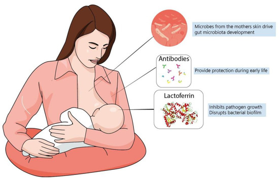 A newborn’s own microbiome development is started from their own mother’s; vaginal delivery is a major event in this process of microbial transfer. Babies delivered by cesarean section miss this step and may be more prone to have allergies, asthma and slower immune development [143,144]. Interestingly, it has been observed that the vaginal microbiome of preterm mothers differs from that of term mothers, with a reduced abundance of beneficial microbes, such as Lactobacillus [140]; it is possible that such imbalances contribute to proinflammatory cytokines and could increase preterm delivery probability [140]. It has been speculated that breastfeeding is another important process shaping the newborn microbiome since skin-to-mouth contact during suckling allows the entry of beneficial microbes derived from the mother. Furthermore, the composition of colostrum and milk have a determinant role, since diet is the main driver in microbiome formation and maternal milk likely has a unique balance between lipids, proteins and oligosaccharides that contribute to microbiome development [145] (Figure 2). In fact, evidence suggests that formula-fed infants are more susceptible to allergies and have lower microbiome diversity. This is probably because formulas up to this time are more focused on macronutrient composition but do not fulfill the possible “functional” roles of maternal milk [125]. In this context, lactoferrin has been shown to have many roles in regulating immune function, whether endogenously produced or from the diet.