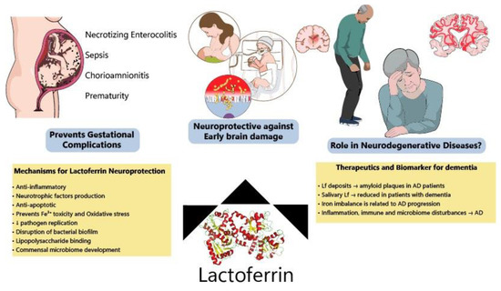 Protective effects of lactoferrin through the lifespan. Lf has been shown to prevent disturbances during pregnancy, decreasing the incidence of NEC, sepsis and prematurity among other complications. Allied to this, clinical and preclinical data have indicated that Lf modulates several pathways (ion scavenger, anti-inflammatory, anti-apoptotic and improving microbiome) protecting the developing brain. Lf has also been considered a potential biomarker of neurodegeneration and its mechanisms of action make it a good candidate to be tested for the prevention of neurodegenerative diseases.