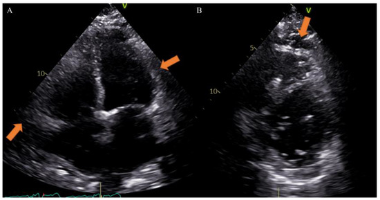 Case of a 65-year-old male patient underwent to echocardiography showing epicardial fat tissue on four chambers ((A), arrow) and short axis ((B), arrow) views. From Giuseppe Muscogiuri’s private archive of unpublished cardiac imaging.