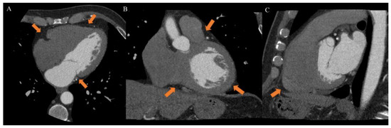 Case of a 46-year-old male patient underwent to cardiac computed tomography angiography (CCTA) for atypical chest pain. CCTA showed epicardial fat on axial ((A), arrow), coronal ((B), arrow) and sagittal ((C), arrow) planes. From Giuseppe Muscogiuri’s private archive of unpublished cardiac imaging.
