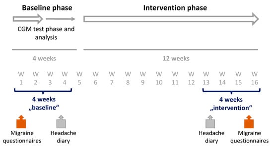 Eligible patients received free access to sinCephalea. Patients used the DTx over the course of 16 weeks as described above. The baseline phase was set to be the first four weeks in which the patient’s glucose reactions to their normal diet and test meals were recorded for evaluation, before receiving the dietary recommendations. The baseline phase was also conducted to prospectively assess disease severity. Disease severity was defined by the number of migraine headache days in a 28-day period. The baseline phase was then followed by a twelve-week intervention phase. During this phase, patients were instructed to follow their personalized nutrition and lifestyle recommendations (Figure 1). The first access code of the first study was activated on 30 September 2020 (“first patient in”). Data collection ended on 21 April 2021 (“last patient out”). The first access code of the second study was activated on 19 November 2021 (“first patient in”). Data collection ended on 6 May 2022 (“last patient out”). The study design follows the recommendations of the International Headache Society for conducting trials with medications for the prophylaxis of migraine as well as the recommendations for the use of health technologies in the treatment of migraine [,].
