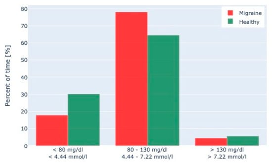 Continuous Glucose Monitoring (CGM) data of migraine patients and healthy patients. A comparison of CGM data of 49 migraine patients with those of 103 healthy individuals matched for BMI, age, and weight showed that migraine patients spent significantly more time in a glucose range between 80–130 mg/dL and less in the range < 80 mg/dL.
