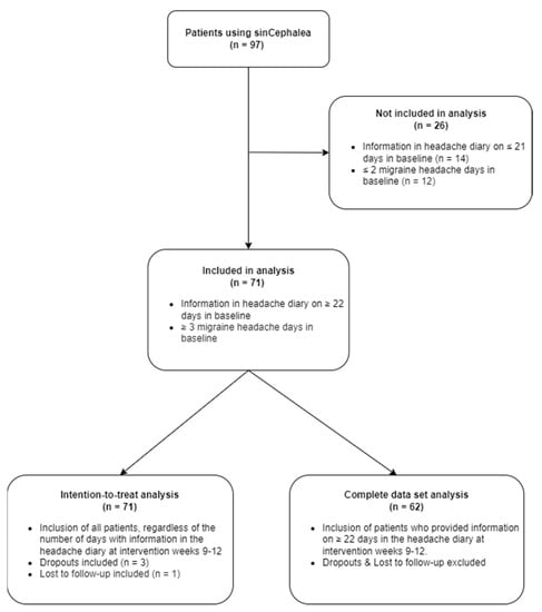 Flow chart of patients included in the second study. 97 patients activated the access code to the DTx sinCephalea. 71 patients were included in the analysis as they fulfilled the criteria of completed headache diary on at least 22 days and reported migraine headache on at least three days in the baseline phase. 62 patients also provided information on at least 22 days of the last four weeks of the intervention phase and were included in the completed data set analysis. Missing data of the last four weeks of the intervention phase from the remaining nine patients was analyzed using imputation with baseline-observation-carried-forward (intention-to-treat analysis).