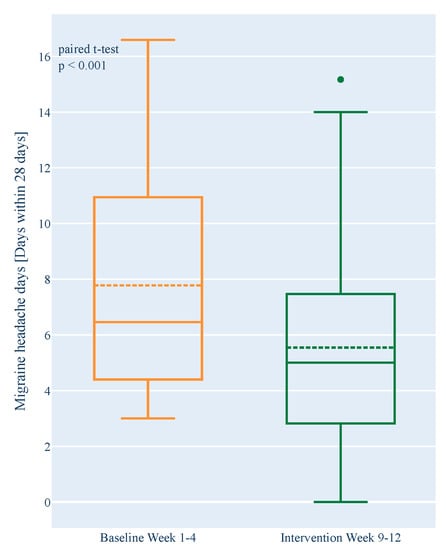 Change in the number of monthly migraine headache days between the four-week baseline phase and the last four weeks of the intervention phase in the complete data set analysis (n = 62). Number of headache days was assessed by daily headache diary. Boxplots show 1st quartile, median (solid line), mean (dashed line), and 3rd quartile. Outliers are marked with dots.