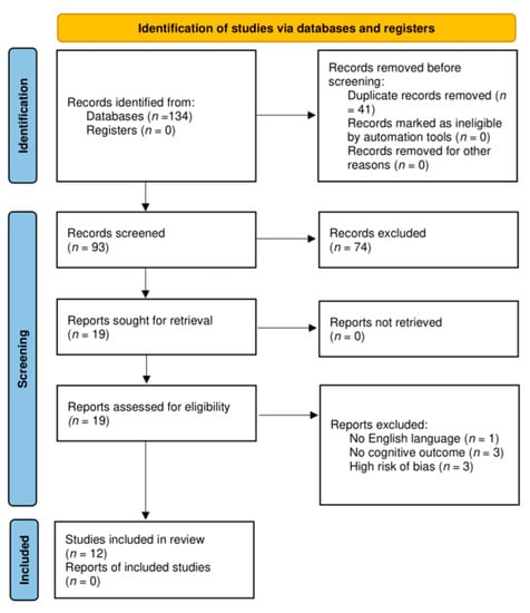 We initially retrieved 134 potential articles published until March 2022. After excluding 41 duplicates, we retained 93 articles. Next, we discarded 74 irrelevant articles based on title or abstract (31 did not report a cognitive outcome, 28 were excluded as they were not RCT, 12 did not use berries of berry preparation as intervention, and 3 were performed in children or adolescents). The remaining 19 records were assessed for eligibility. We discarded 1 article not written in English and 3 studies not in line with the purpose of this review. A complete report of study characteristics and RoB 2 results are available in Table S1 of the Supplementary Materials. Studies that had as overall a low risk of bias (10 studies) or some concerns (2 studies) were considered acceptable for inclusion in the systematic review, conversely studies that had high risk of bias (3 studies) [23,24,25], mainly due to the randomization process, were excluded (see Figures S1 and S2 of the Supplementary Materials). Finally, 12 studies were included for the present review [26,27,28,29,30,31,32,33,34,35,36,37].