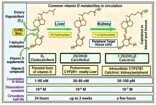 The figure illustrates the structures of the three most familiar, clinically relevant vitamin D analogues, their primary in situ sites of generation, respective hydroxylating enzymes and reported concentrations in the bloodstream. While in humans, the circulatory levels of D3 and 25(OH)D3 are present in the nanomolar range, 1,25(OH)2D is in the picomolar range: approximately a thousand-fold lesser concentration (numerical data from Hollis et al., added in the last two rows, []).